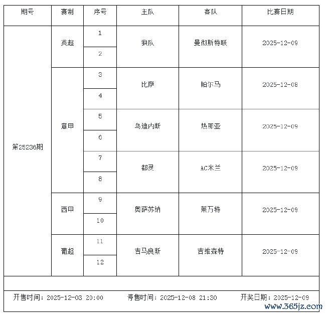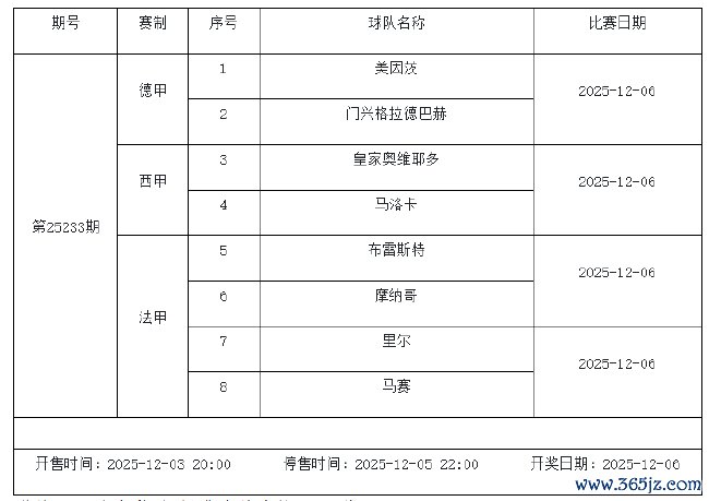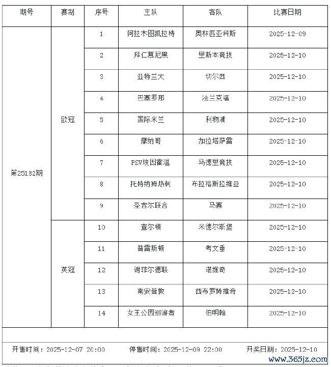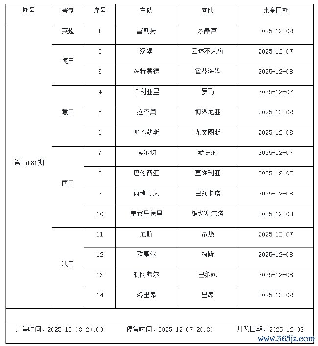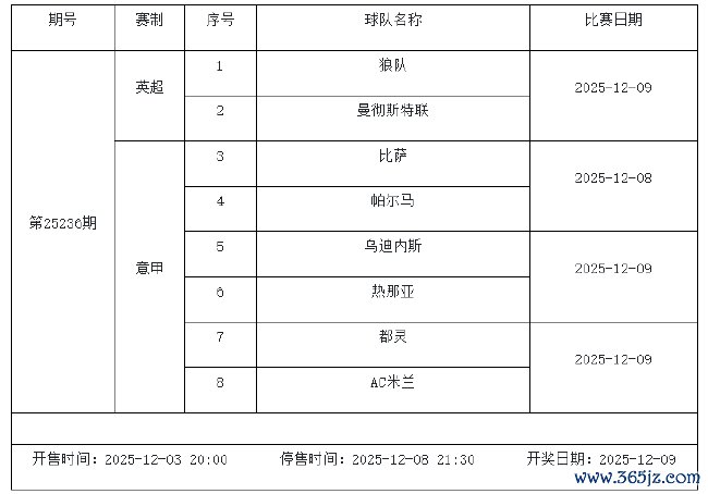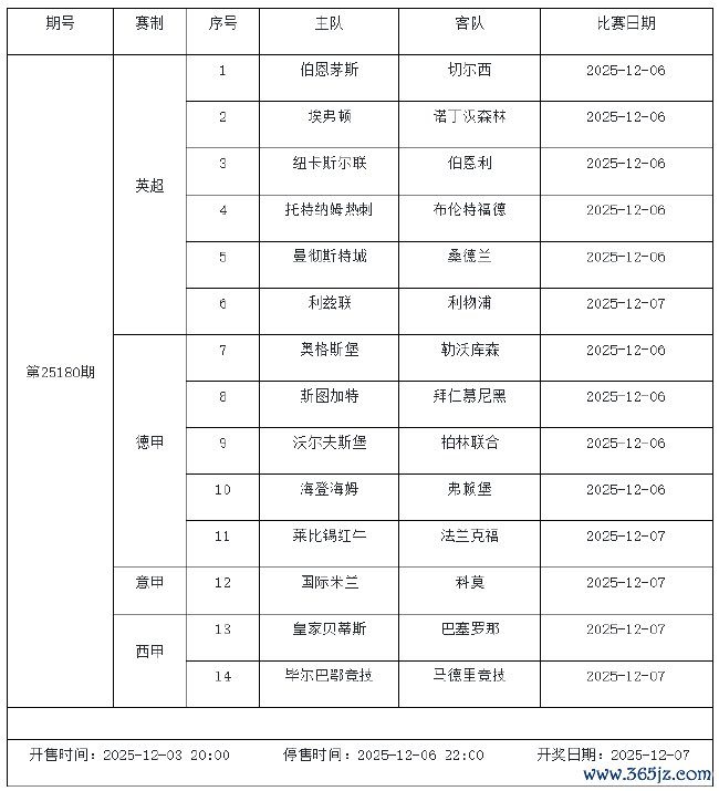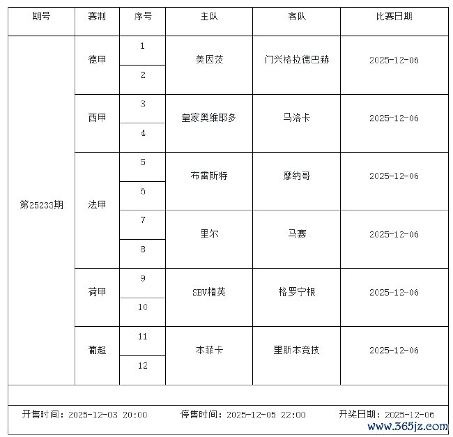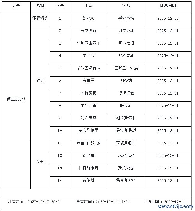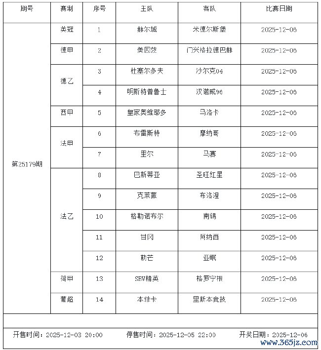 我中心制定了2025年中国足球彩票赢输游戏(14场、任选9场)、6场半全场赢输游戏和4场进球游戏12月5日-12月11日的竞猜场次安排(具体附后),其竞猜对象、开售时辰、停售时辰和计奖时辰均以本文为准。