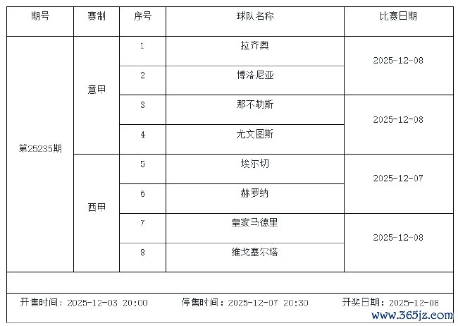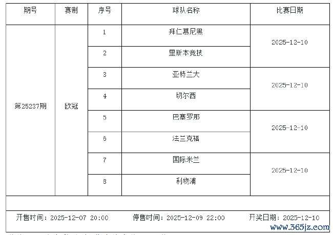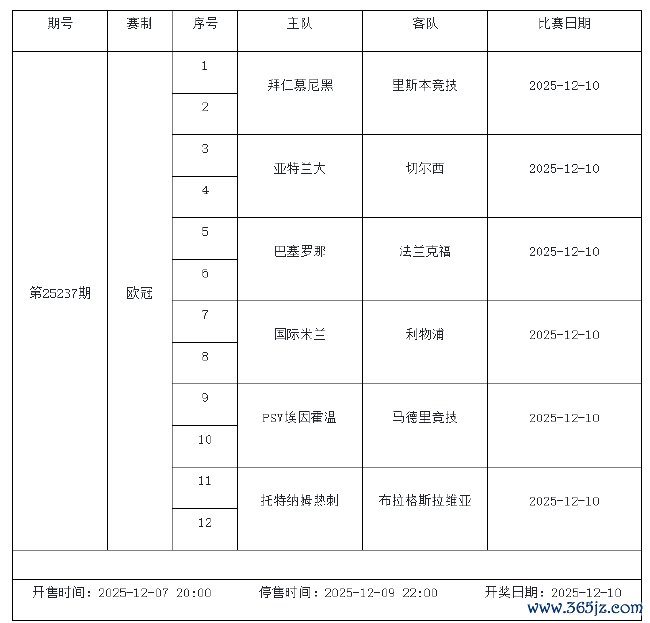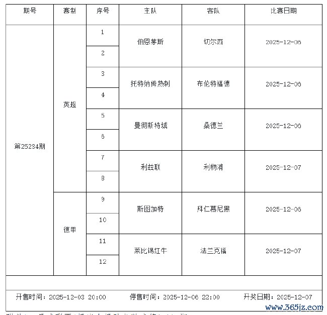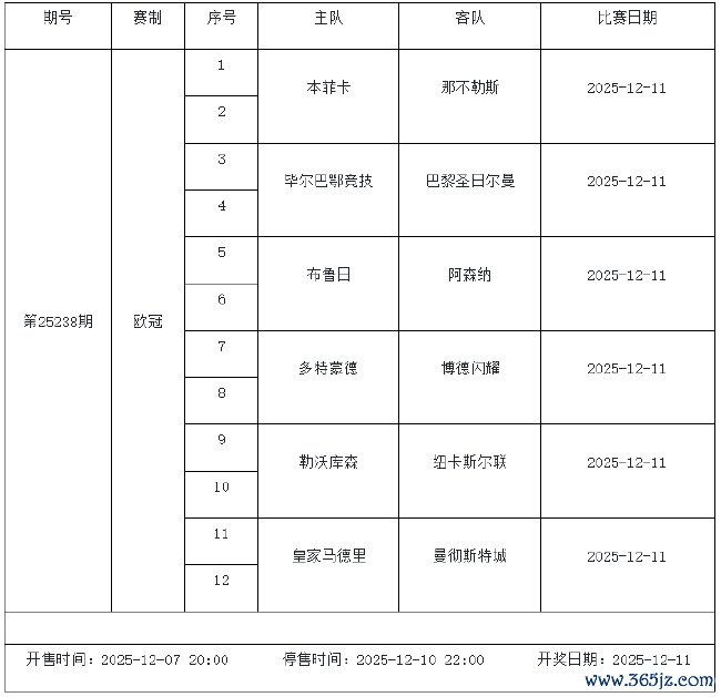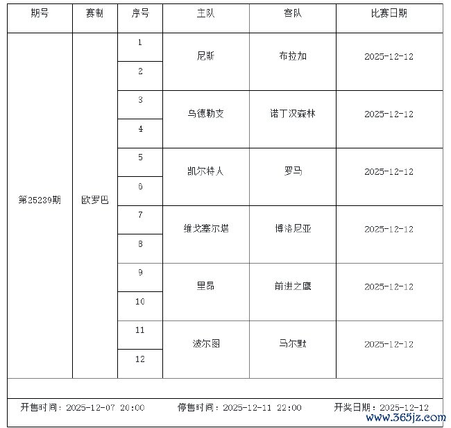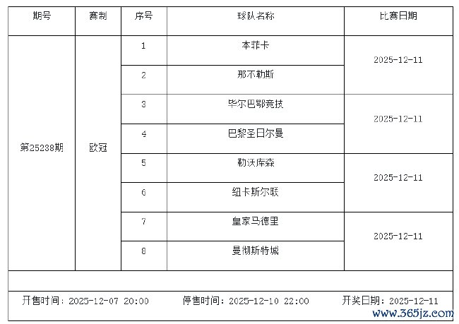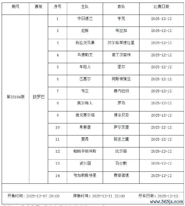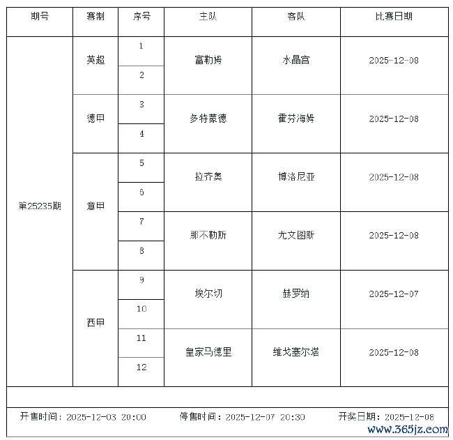 我中心制定了2025年中国足球彩票赢输游戏(14场、任选9场)、6场半全场赢输游戏和4场进球游戏12月5日-12月11日的竞猜场次安排(具体附后),其竞猜对象、开售时辰、停售时辰和计奖时辰均以本文为准。